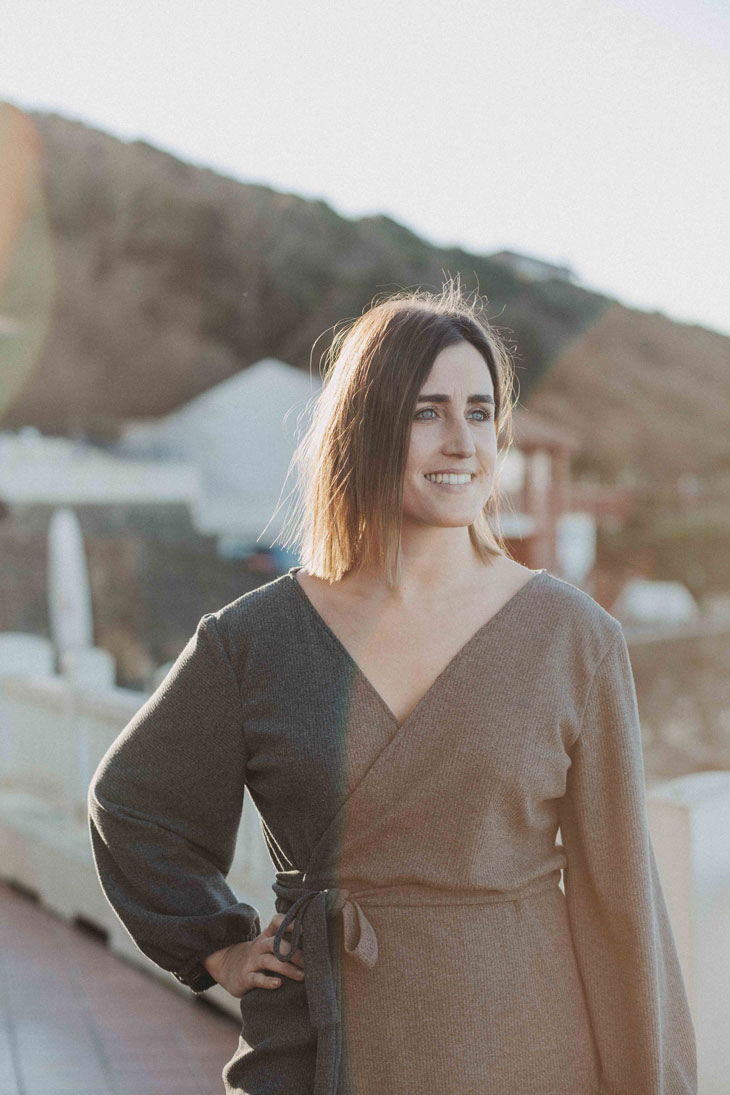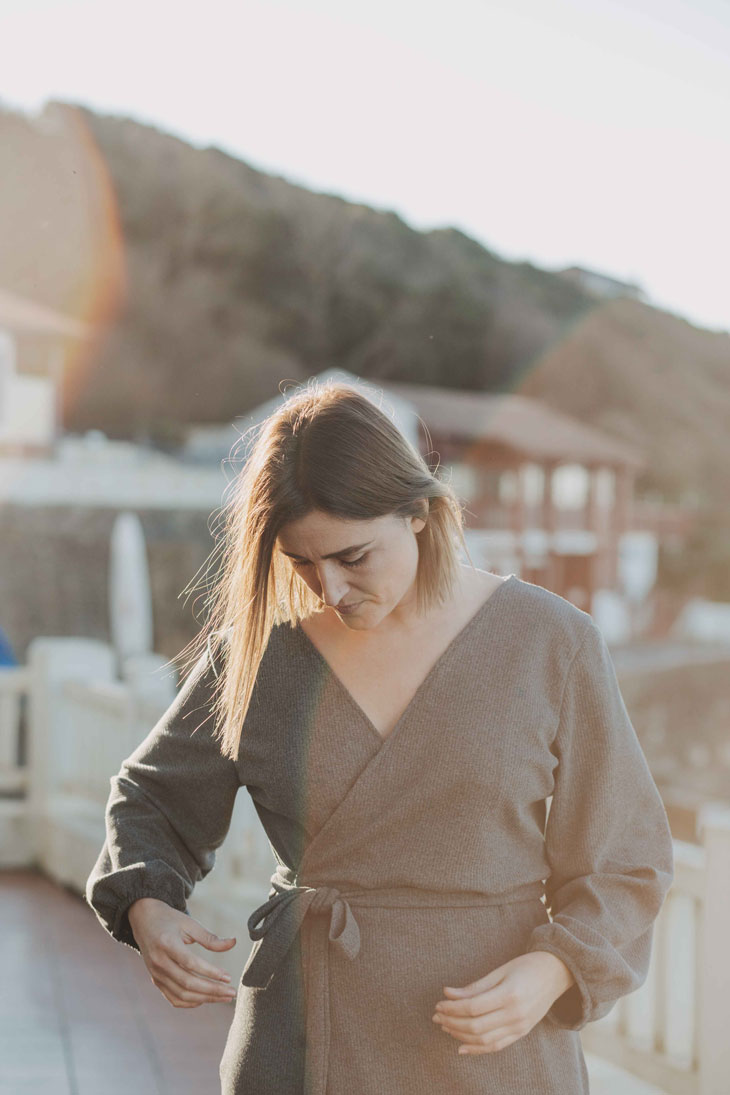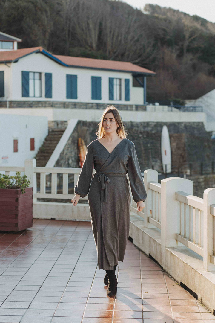 El vestido Tsubaki, está confeccionado en un tejido de punto de canalé gris.